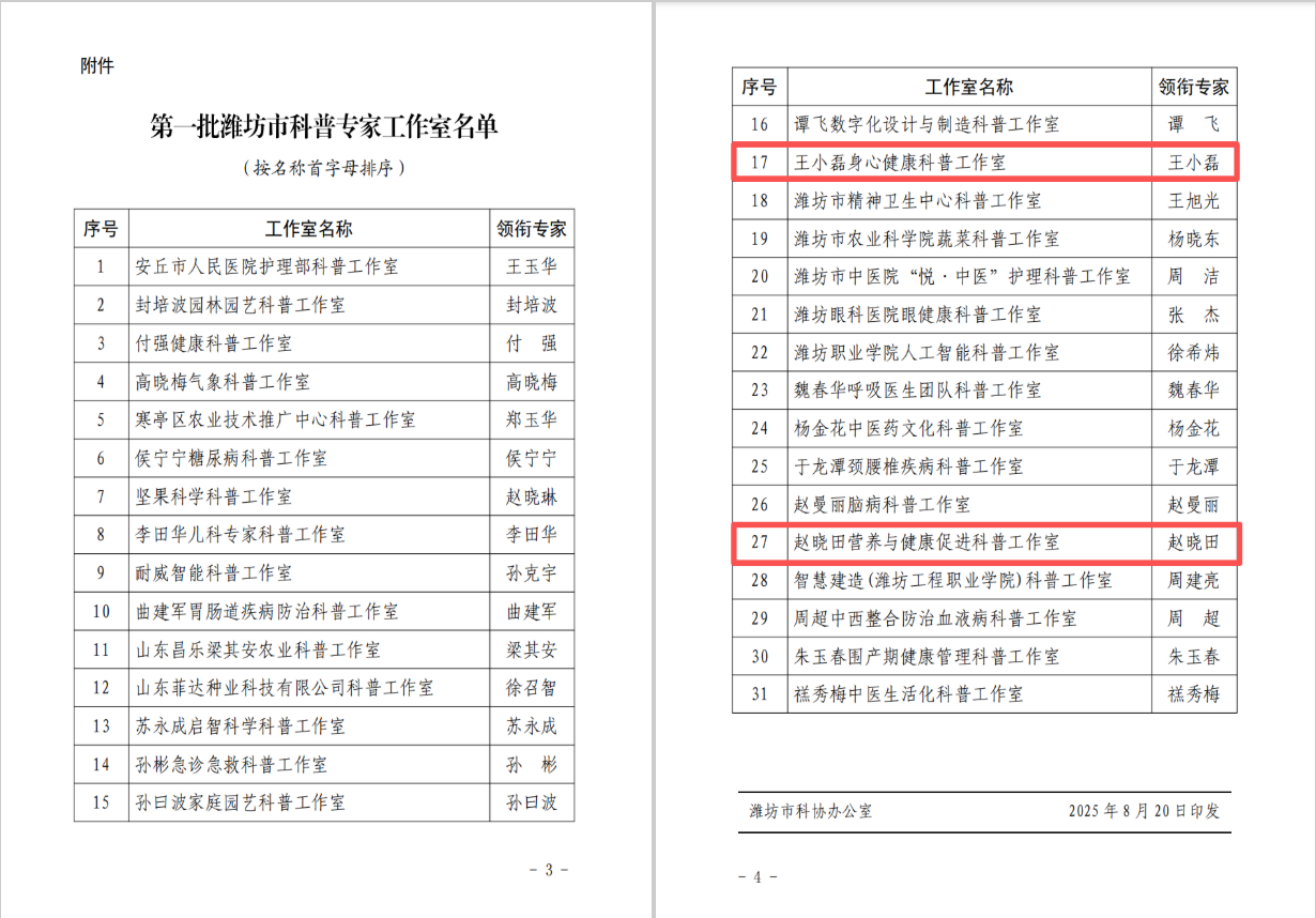 近日,潍坊市科学技术协会和潍坊市科学技术局联合发布了《关于公布第一批潍坊市科普专家工作室的通知》,此次共认定31个工作室为第一批潍坊市科普专家工作室。其中,我校王小磊老师领衔的“王小磊身心健康科普工作室”和赵晓田老师领衔的“赵晓田营养与健康促进科普工作室”成功入选,标志着我校在科普工作方面迈上了新的台阶。