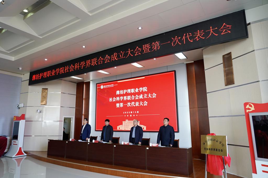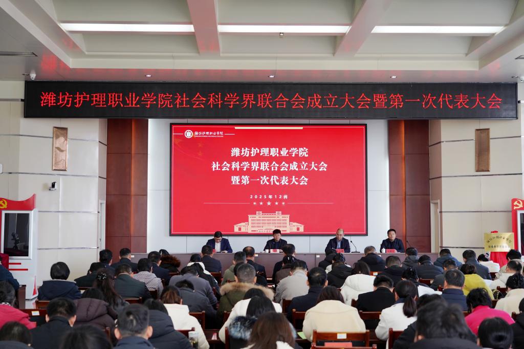 12月24日下午,潍坊护理职业学院社会科学界联合会成立大会暨第一次代表大会顺利落下帷幕。潍坊护理职业学院党委副书记、院长王文军出席会议并讲话。校领导赵立增、郭兴华、吴殿臣及全体代表参加。会议由党委委员郭兴华主持。会议的成功召开,标志着学校哲学社会科学事业迈入高质量发展新阶段。